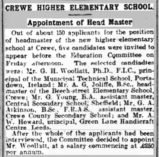 After moving to Crewe, Walter attended the Higher Elementary School on Brierley Street,  and must have been one of the first pupils to enrol when the new school opened in 1908. The  headteacher in 1908 was Mr G. Woolatt, who had previously been a headteacher in Portadown, Ireland.