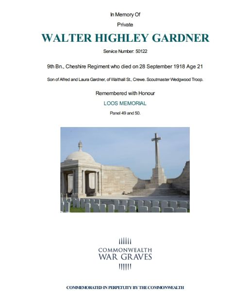 Private Walter Highley Gardner was killed in action on Saturday 28th September 1918. He was 21.