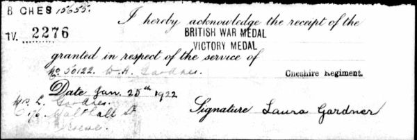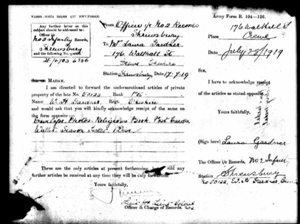 The family's address in April 1911 was 34 Buxton Avenue, Crewe, but by the time Walter enlisted into the Cheshire Regiment at Crewe on 22nd November 1915, they had moved to 176 Walthall Road, where his parents were still living in June 1921. (They later moved to Watford, in Hertfordshire.)