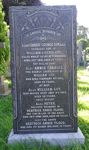 The friends of Mr. and Mrs. W. Goy 145, Grange Road, will learn with the deepest regret of the death of Flight Lieut. E. G. Goy, late R.N.A.S., who met his death at Stonehenge on the 24th inst. in a flying accident. Further details are not yet to hand but Mr. and Mrs. Goy have been the recipients of a message of sympathy from the late Lieut. Goy’s commanding officer.