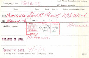 Harry's name is mentioned in the battalion war diary, it gives his date of death as 16 January, this is not uncommon as the diaries were often written up days later, so mistakes on dates can be expected. The diary states, 16/1/16 Relieved 2nd Bn. Yorkshire Regiment in the trenches. Shell dropped in No.2. Company trench, 18/16652 Pte. S. Evans and 18/26647 Pte. H.C Burgess being killed.