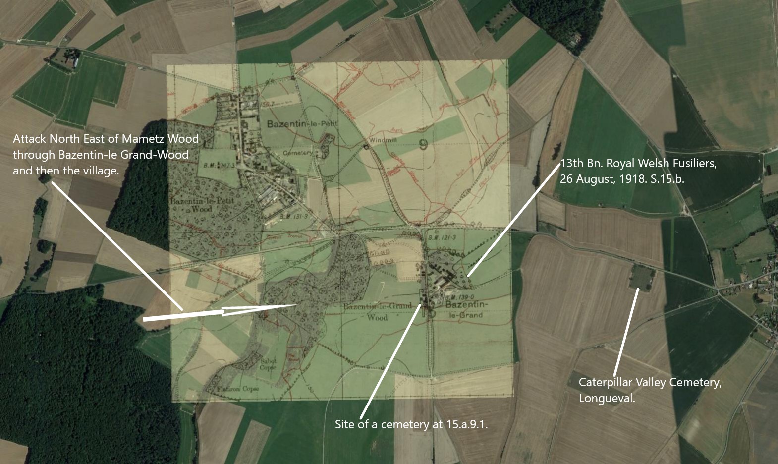 4am after a preliminary bombardment, battalion launched an attack on Bazentin le Grand Wood and village, with the 14th and 16th battalions in support plus the 2nd battalion guarding the right flank and mopping up the wood, after being held up for considerable time by MG fire the wood and village was eventually carried and the line advanced to east of the village at S 15b.