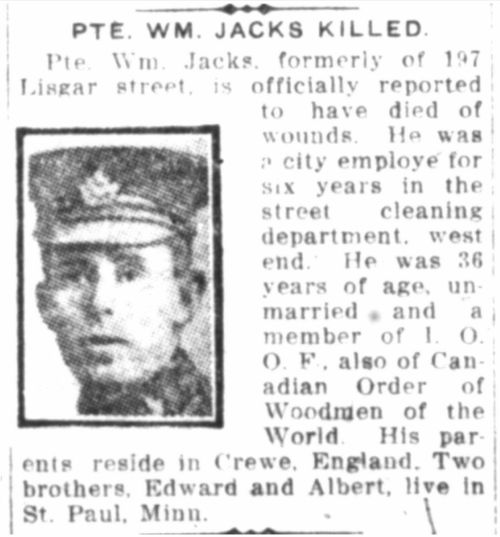 Private William Jacks, formerly employed at the Crewe carriage works for about 12 years, has been killed in action. In 1909 he migrated to Toronto, Canada, and obtained employment under the municipal authorities. He was living there until the 19th of February 1916, when he volunteered to join the Canadian Infantry. After going through training in Canada, along with the remainder of the battalion, he was sent to Shorncliffe camp in England to complete the training. Eventually the battalion underwent some changes, and they were sent over to the front. Private Jacks fell on October 11.