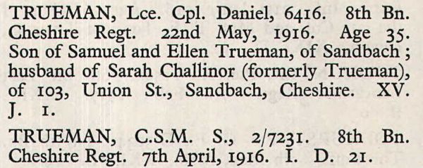 Daniel was born in 1882, the oldest son of Samuel Trueman and Mary Ellen Stubbs of 55, Union Street Sandbach. He married Sarah Wilson (1883 - 1962) on 30th December 1911. They had two children, Sam and Elsie, and resided at 103 Union Street, Sandbach.