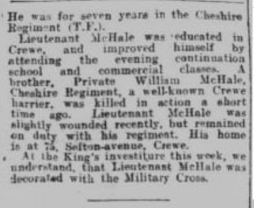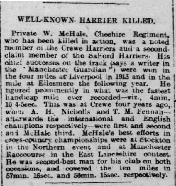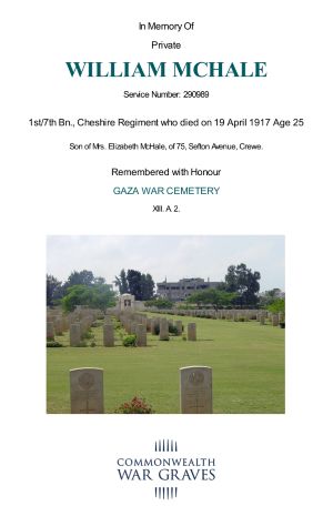 Private William McHale ,1/7th (Terr.) Bn. Cheshire Regiment was killed in action on 19th April 1917 aged 25, during the Second Battle of Gaza (Palestine). He was a well-known cross-country champion who was a member of Crewe and Salford Harriers. He, along with his best friend Tom Fennah (killed in 1915), were both chosen in pre-war days to compete in the 1916 Berlin Olympic Games.