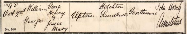 William was born on 22nd August 1898, in Sandbach, the only son of George Henry Upton and Jessie Mary Simpson, of Betchton, near Sandbach. He had an older sister Alice Mary Upton born in 1895. William was baptised at St Mary's Church in Sandbach on 2nd October 1898. His father's occupation was recorded as "Gentleman".