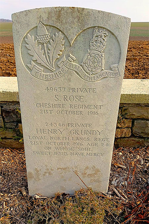 | Commemorated\Buried | Stump Road Cemetery, Grandcourt Grave\Panel Ref: C.27. |