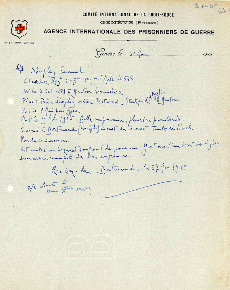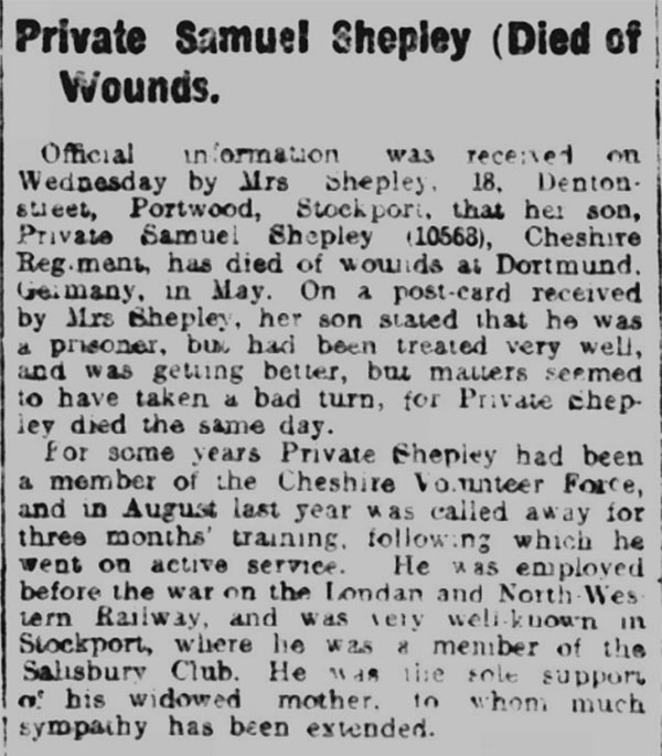 The 1901 Census confirms that Samuel's parents were Peter, aged 56 and working as a mechanic's labourer at a mill and Mary, aged 50. It suggests he had an older brother, Ralph, then aged 32 and working as a cotton spinner. Samuel was also working as a mechanic's labourer, but later, went to work as a labourer for the London & North Western Railway Company at Heaton Norris station. He is commemorated on the LNWR's Roll of Honour. Samuel had been a member of the Cheshire Volunteer Force in the early years of the 20th century, and he remained a member when it became the Territorial Force in 1909. However, he must have left the Territorials some time before the war, as he was not mobilised with the other members of the 6th Cheshires. His service number indicates that he enlisted in August 1914, within days of war being declared on the 4th. After training, he joined the 1st Battalion 2nd January 1915. Samuel was taken prisoner not long before he died. On the day he died, he sent his mother a postcard saying that he had been treated well and was recovering from a wound.