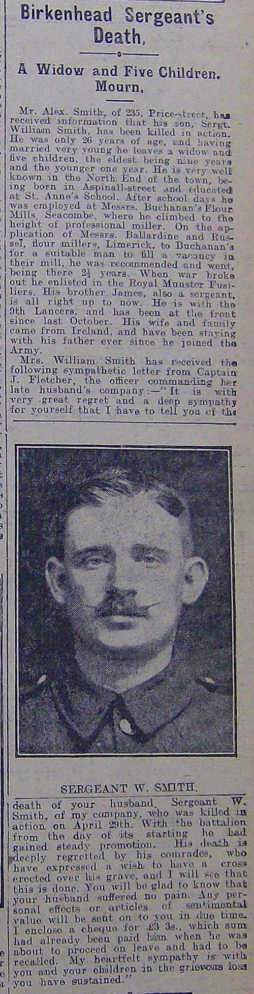 Following the outbreak of the First World War William Smith joined the 9th Battalion of The Royal Munster Fusiliers. He arrived in France on 19th December 1915. In April 1916 William, now a sergeant, was with his battalion based around the Loos area and on the 29th of that month they were in the trenches at Puits 14 Bis. The Germans launched a bombardment on the front line and during that action William was killed. His widow Margaret was awarded a war pension.