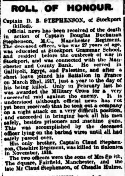 Claudius Stephenson and Stella Carpenter had married in 1884 in King's Lynn, a town in which Stella had been born. A couple of years later, their first child, who they named Stella, was born in Essex. The family had moved to the South Manchester area by 1889 and their two sons, Claude and Douglas, were born there. Douglas' date of birth was 19 December 1890. A second daughter, Norah, was born in King's Lynn in about 1893. The 1901 Census records the family living at 11 Albert Road, Cheadle Hulme. The family were clearly financially comfortable, as Stella is recorded as "living on own means" and she could afford to employ Rebekah Cole as a live-in "mother's help". During 1904, Stella remarried to James Smith at St Mary's Church, Cheadle. After the war, in the early 1920s, Stella Smith had moved away from the Stockport area and was living at 41 The Square, Fairfield, Manchester. Douglas was educated at Stockport Grammar School and then went to work for the Manchester & County Bank at its branch at Market Place, Stockport. His service file still exists at the National Archives but contains little personal information. It does show that he was short man, even for those times, standing at only 5' 4". He had been a member of the pre-war Territorial Force serving as a private with the 6th Battalion, Manchester Regiment. On 29 May 1912, he was commissioned as 2nd Lieutenant. At some point after this, he transferred to the 9th Battalion and was mobilised when war was declared in August 1914. The men spent the next seven months in Egypt before going into action at Gallipoli and it is presumed that Douglas was with them. The next mention of him in official records is on 3 January 1916 when he was promoted to Acting Captain as he was then commanding one of the Battalion's Companies. Around early January 1918, he led a raid on the enemy trenches. His bravery was recognised by the award of the Military Cross. The citation, published in the London Gazette on 19 April 1918, reads: "For conspicuous gallantry and devotion to duty. When in command of a raiding party, he showed great dash and, at one place where the wire was not cut, himself lay on the strands, thus enabling the men to pass over. He displayed great resolution and prior to the operation which resulted in the capture of seven prisoners and two machine guns, twenty-five of the enemy being killed, he showed the most commendable keenness and inspired his men with great confidence which helped to ensure success." On 21 March, the long awaited German attack was delivered with overwhelming force. Within hours, the British Army was undertaking a desperate fighting retreat along a wide front. It is not surprising, therefore, that there are sparse details of the day recorded in the Battalion's War Diary. It records, however, that at 4.30am, they were ordered to "battle stations". They had to move into their designated position through a heavy gas bombardment which caused about 30 casualties. It then says, simply, "the battalion went into action and continued in action till April 1st." In fact, although the 9th Battalion was kept in reserve, there was desperate fighting and, by the end of the day, the Battalion had been forced to retreat to avoid being cut-off. Nearly 70 men were dead. Like Douglas, few have a known grave. One of the men with him on the raid, Frank Thickett, was with him when he was killed a few weeks later.