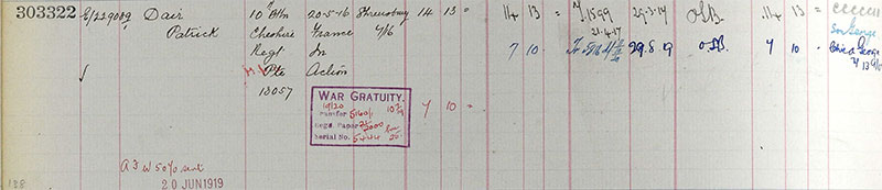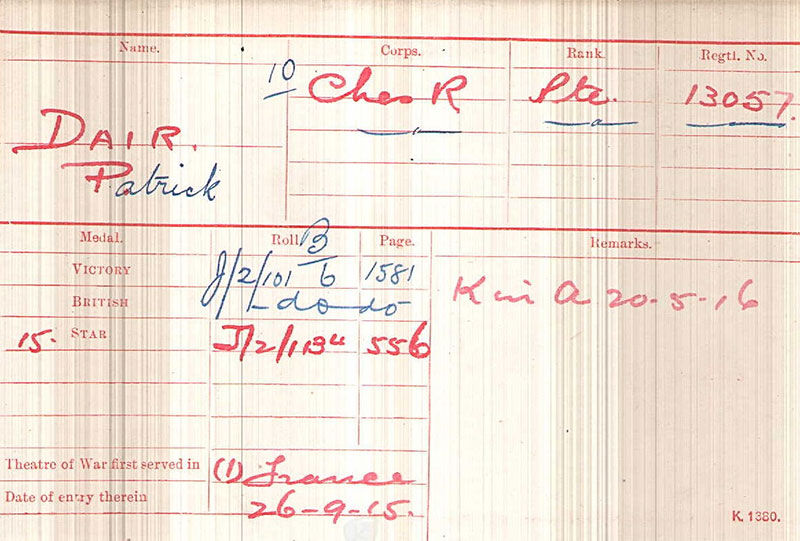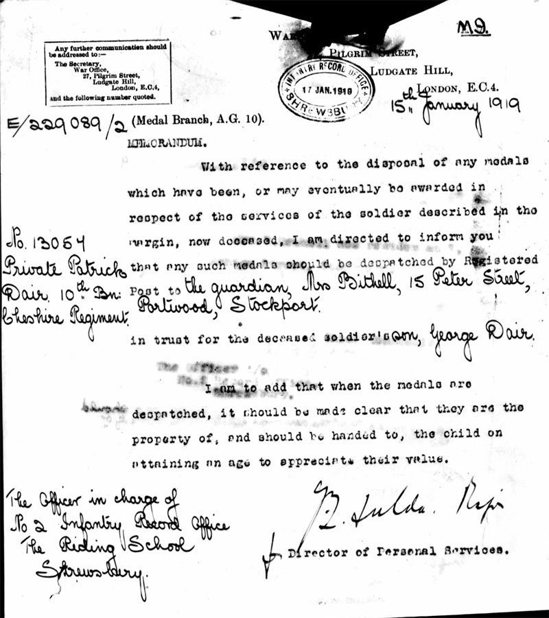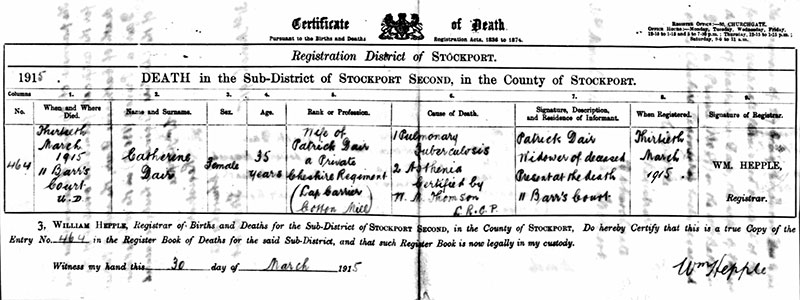 Patrick was born in Rochdale but, by the time of the 1901 Census, the family had moved to Stockport. However, Patrick does not appear to be listed on the Census although a John Dair, aged 31 and Mary Dair, aged 20 are shown living in the town. They were possibly his brother and sister. December 12, 1902, Patrick married Catherine Ditchfield. They lived, with their two children, at Barr's Court, Fountain Street, in the Portwood area of town. Patrick worked locally at the Portwood Spinning Company. The 1911 census shows the family living at 18 Heald Street, Portwood with two of Catherine’s brothers, the census also shows that Patrick and Catherine had four children Elizabeth 10, Patrick 7, George 3, and Kathleen 1, a fourth child Bertha was born in January 1913, sadly she died age 2, December 7, 1915, a couple of months after Patrick had left for France.