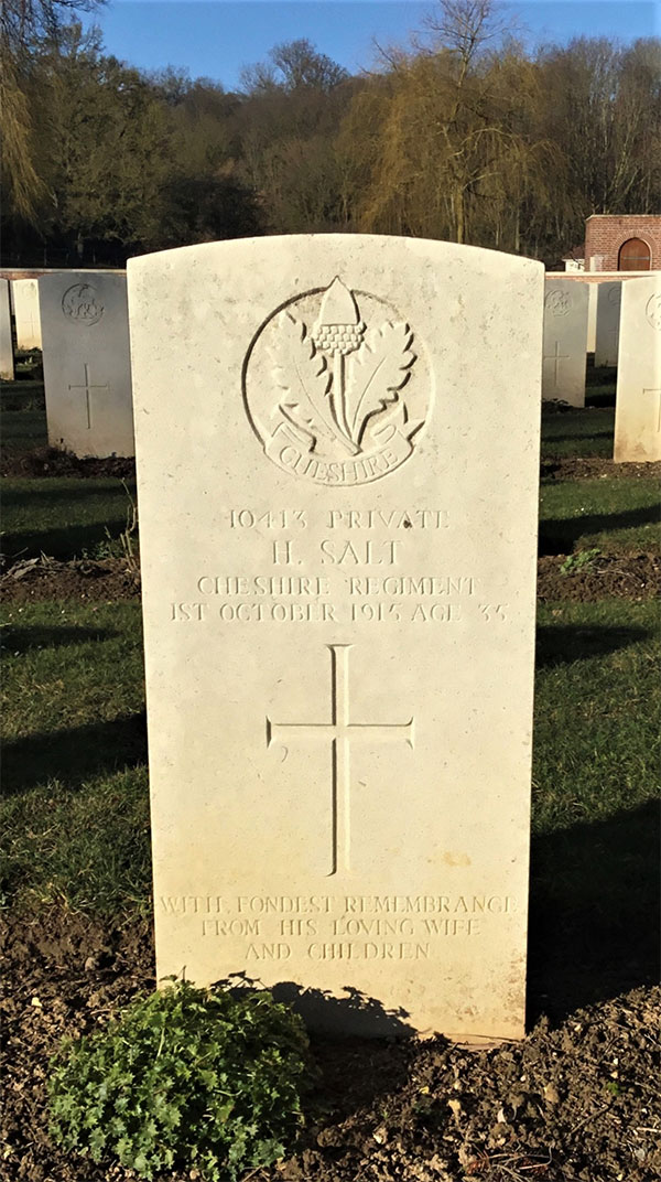 Henry was the son of John & Mary Salt and was born in the parish of St Thomas's C of E Church, Stockport. He was married to Gertrude and they lived at 2 Thomas Street, Hillgate, with their 5 children. Henry's service number indicates he volunteered for the army in August 1914 - just after war was declared. He is, probably, the Harry Salt who is commemorated on a Memorial to those who worked for the Midland Railway Company at the locomotive depot in Heaton Mersey. The Memorial is now at the Railway Club in Edgeley. The Battalion had taken over front-line trenches near Carnoy on 24 September. It's War Diary entry for 1 October reads "Battalion in trenches. Enemy unusually active with sniping and light guns. Casualties O.R. 2 killed, 1 wounded." One of the two Other Ranks was Henry Salt. The other man was Augustus Carty from Wallasey.