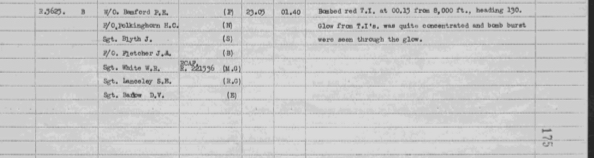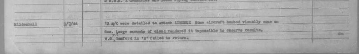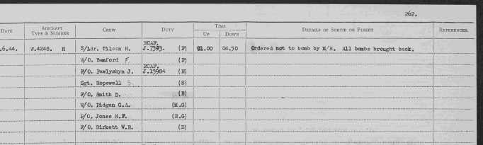 Philip's first Operational mission. He flew as second pilot with Squadron Leader Tilson. When they reached the target they were ordered by the Master Bomber not to bomb as the target was completely obscured by cloud so they carried the bombs back to base.
