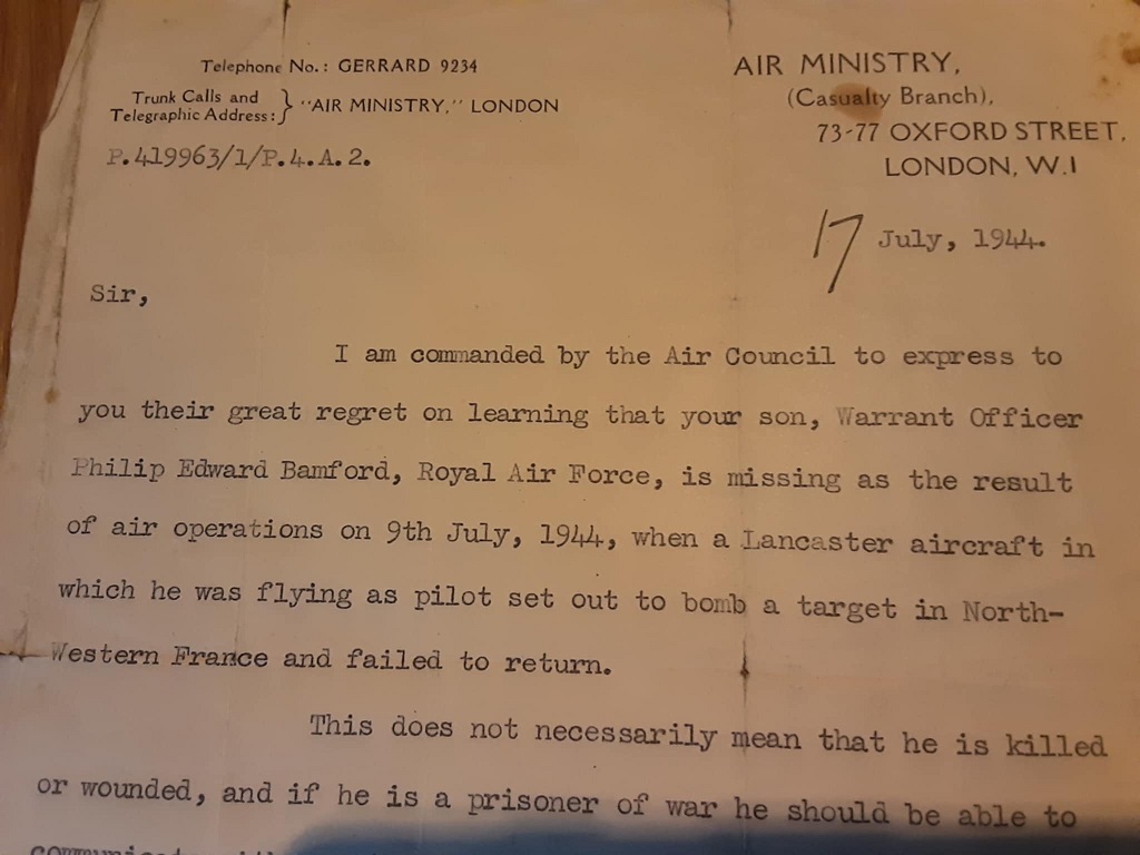 The letter from Air Ministry notifying Philip's family that he was missing ( Credit George Price)