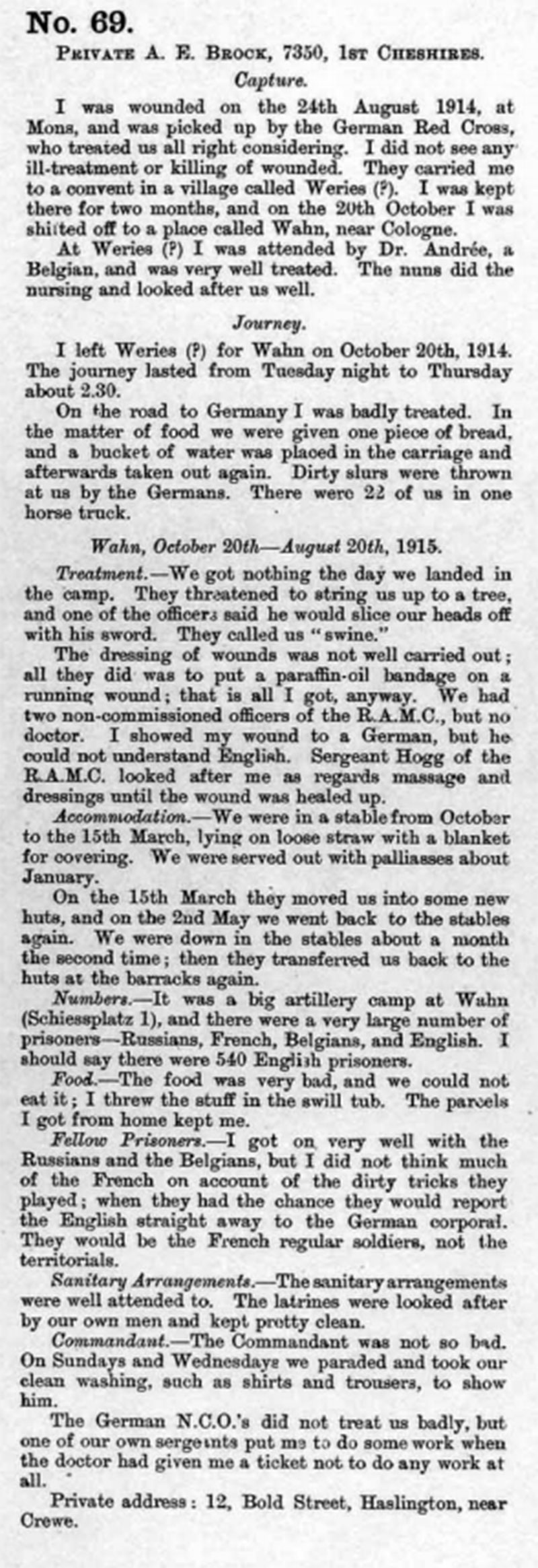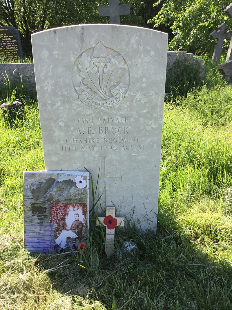 Son of Vincent Henry and Harriet Ann Brock of New Street, Crewe and husband of Maud Brock (nee Cooper) of 12, Bold Street, Haslington. They married at St. Matthew’s Church, Haslington on June 1, 1912. First enlisted on January 8, 1904. Twice served in India (1904 and 1908). Went to France (Le Havre) on August 16, 1914. Fought in the Battle of Mons where he was badly wounded in the right forearm (shrapnel wound just below the elbow joint, which shattered both the radius and ulna bones) on August 24, during the famous rearguard action by the Cheshires at Audregnies (under Captain Dugmore). He was taken prisoner, but later released due to a prisoner exchange, arriving back in England on August 25, 1915. On December 31, 1915 was discharged from the Army as unfit for further war service, due to the bad injury to his arm. He was granted a pension of 12s 6d per week, plus 1s 3d for his child. Just a few months later was found hanged under the staircase of his home after suffering from deep depression. By all accounts, following his discharge from the Army, he had been subjected to abuse for not being in uniform and this had had a detrimental affect on his mental health. His demise was discussed in Parliament (June 27, 1916) which eventually led to the introduction of the Silver War Badge, which was awarded from September 1916, to all discharged servicemen. Below is the entry from Hansard: