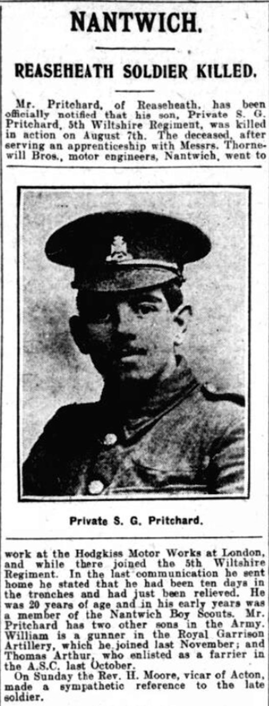 Born Worleston, enlis ted Marylebone, London. Son of William and Ellen Pritchard of Reaseheath. Served his apprenticeship with Thornewill Brothers, Motor Engineers of Nantwich, then went on to work at The Hodgkiss Motor Works in London. Former Nantwich Boy Scout. Landed at Anzac Cove on August 4, 1915.