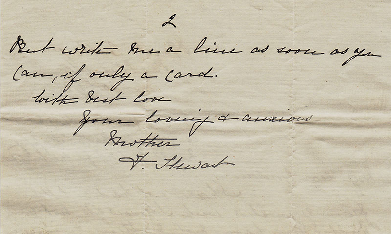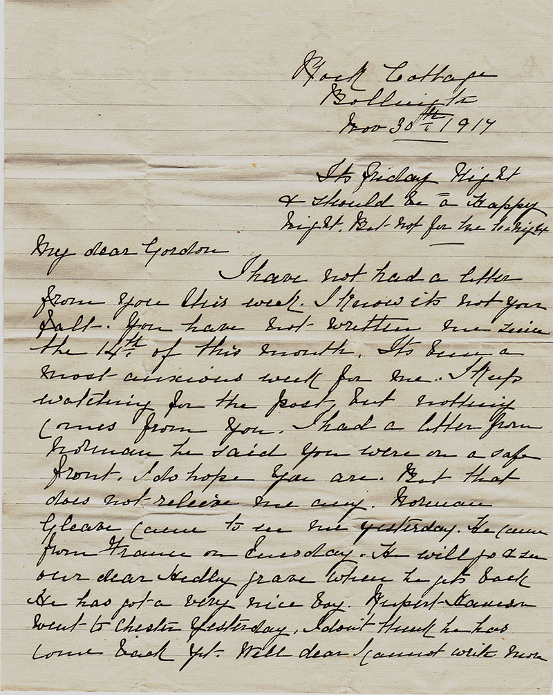 My dear Gordon, I have not had a letter from you this week. I know its not your fault. You have not written to me since the 14th of this month. Its been a most anxious week for me. I keep watching for the post. But nothing comes from you. I had a letter from Norman, he said you were on a safe front, I do hope you are. But that does not relieve me any. Norman Gleave came to see me yesterday. He came from France on Tuesday. He will go and see our dear Hedley’s grave when he gets back. He has got a very nice boy. Rupert Hamson went to Chester yesterday. I don’t think he has come back yet. Well dear I cannot write more. But write me a line as soon as you can, if only a card. With best love, your loving and anxious mother, F. Stewart.”