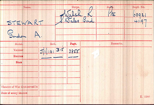 Gordon enlsited into the Welsh Regiment becoming 60921 Private Stewart. At some point after arriving in France he was transferred to the South Wales Borderers, 2nd Battalion.