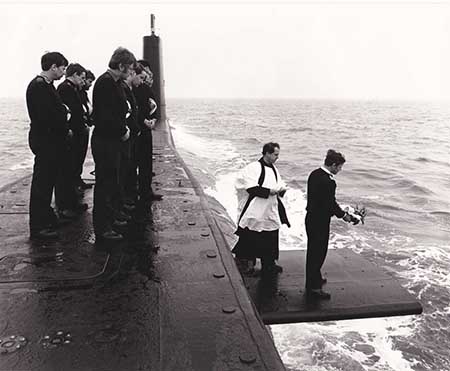 Wreath laying from a Royal Navy submarine at the site of the wreck of HMS Swordfish in November 1983.