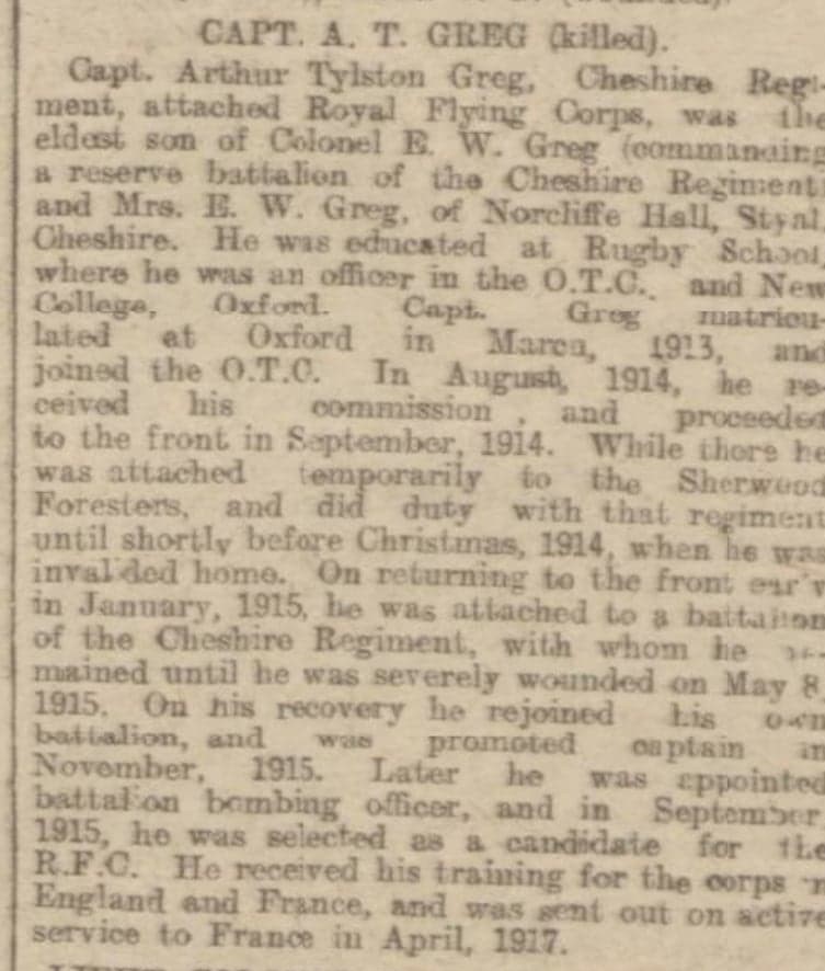 At the outbreak of war, Arthur joined 15 August 1914, initially as a 2nd Lieutenant in the 3rd Reserve Battalion Cheshire Regiment. He was drafted to France, 25 October 1914, where he was attached to the 2nd Battalion, Notts and Derby Regiment, (Sherwood Foresters), 18th Brigade, 6 Division. Arthur was invalided home, however, once recovered he returned to the Front line in January 1915, and was attached to the 1st Battalion Cheshire Regiment, who were in the 15th Brigade, 5th Division. On 2 February 1915 he was promoted to Lieutenant, yet again he was severely wounded at Ypres on 6 May 1915, shot through the jaw by a German sniper, he was taken to No 7 Stationary Hospital, Boulogne, and then sent home for 3 months recuperation. Arthur was promoted to Captain, 19 November 1915 with the 3rd Reserve Battalion, Cheshire Regiment, having qualified as Bombing Instructor at the Bidston, Wirral, training camp in September 1915. His next move came when he was attached to the Royal Flying Corps as a candidate, training in England and Vendome, France, in September 1916. On 28 February 1917 he was moved to the 44th Reserve Squadron. He was gazetted, AIR 76/195/99, 27 March 1917, Flying Officer Captain A. T. Greg. Arthur joined the 55th Squadron on 4 April 1917 and nineteen days later, flying at about 18,000 feet he was shot, his observer managed to bring the machine down, just inside the French lines at Urvillers neat St Quentin, he died Monday, 23 April 1917, of his injuries, he was aged 22 years.