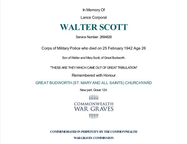 Lance Corporal Walter Scott died on 25th February 1942, aged 26. He was killed in a motorcycle accident at Compton Chamberlayne near Salisbury, Wiltshire.