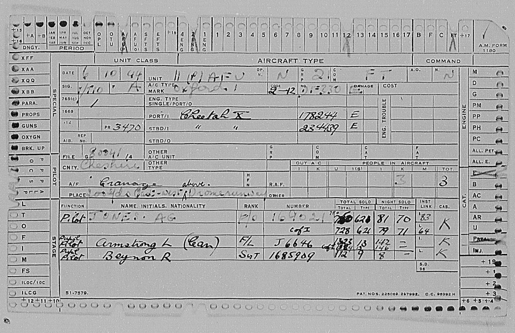 . He received a commendation in the King’s Birthday Honours list in 1944 in recognition of his contribution to pilot training. He departed Canada on 16th June 1944 and arrived in UK on 24th June 1944. On 5th September 1944 he was posted to 11 (P) AFU at Calveley in Cheshire for advanced pilot training. On 3rd October 1944 he was attached to 1531 Beam Approach Training Flight located at RAF Cranage in Cheshire.