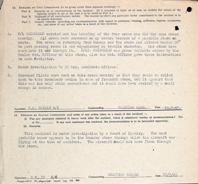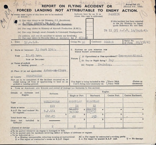 On 13 September 1943 he was onboard Wellington BJ664 engaged in a navigational exercise with seven other personnel onboard. The plane was caught is a severe thunderstorm and the pilot lost control and crashed at Aston on Chun, 9 miles northwest of Ludlow. All onboard were killed.