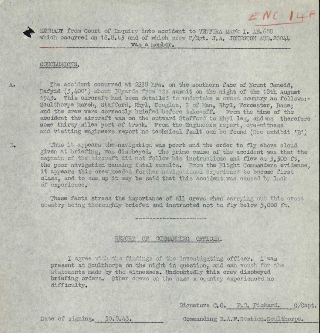 Archibald Sidney Clegg was born in Stratford, Ontario on 25th December 1911 to parents James and Gertrude who were both UK born Canadian citizens. Before enlisting Archibald worked as a painter’s helper at Canadian National Railway company. He enlisted on 13th July 1942 and volunteered for aircrew duty. He completed his initial training as an Air Gunner before being posted to 34 OTU at Pennfield Ridge, New Brunswick. Whilst he was at 34 OTU he met up with Australian pilot James Alexander Johnston and Canadians Eloi Beaudry (Nav/AB) and Lawrence Fullerton (WOP/AG) and the 4 of them trained together in Ventura bombers.On 8th April 1943 Archibald and his other crew members embarked on a ship to UK arriving on 17th April 1943. On 25th May 1943 they were posted as a crew to 464 Squadron RAAF based at RAF Methwold in Norfolk. 464 Squadron flew Ventura light bombers. It was remarked in 464 Squadron’s Operation Book (ORB) that the newly arrived crew had arrived straight from the OTU and would require further training before they could be considered to be ready for operations. By August 1943 the squadron had moved to RAF Sculthorpe in Norfolk and on 18th August 1943 Archibald and his crew were ordered to carry out a nighttime cross country navigation exercise in Ventura AE688 following the route Base to Stafford to Rhyl to Douglas (Isle of Man) then return to base via the same route but adding Worcester to the route instead of Stafford. The crews were instructed to fly the route at 5000 feet altitude. However, at 2238hrs on 18th August AE688 flew into the south face of Mount Carnedd in Dyfed, Wales causing the instant death of all 4 crew members. An enquiry into the cause of the accident found that the primary cause was that the pilot had inexplicably decided to fly at 3,300 feet instead of 5000 feet as ordered. The aircraft was 30 miles off course at the time of the accident and lack of navigation experience was also cited as a contributing factor in the accident.