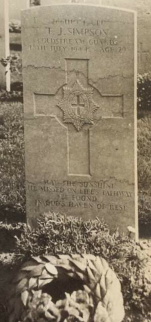 Mr. Mrs. F. Simpson, 102 Claughton Avenue, Crewe, have been informed that their son, L/Corpl. F. J. Simpson has been killed in Italy. Before joining the forces in 1940 he was employed at Crewe Post Office as a sorting clerk. He was wounded in a London blitz in September 1940 but recovered sufficiently to go to North Africa and Italy in 1943. He was 29 and married. At the time of his death he was in charge of a First-Aid party.
