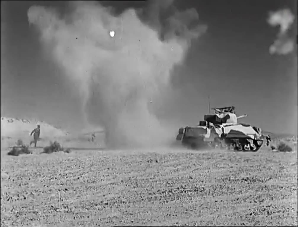 Sherwood Rangers Sherman tank and infantry advance across Wadi Zem Zem under fire