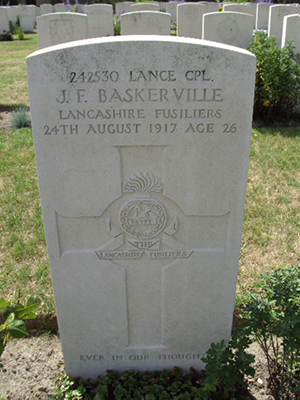John Fred Baskerville was born in 1899, one of seven children born to John and Mary Ann Baskerville of Holly Cottage Marthall, Cheshire. He worked as a farm labourer. He later moved to Siddington, Cheshire.