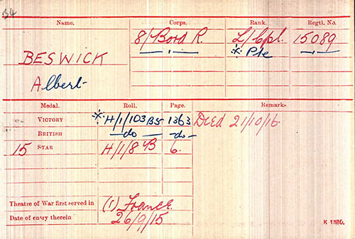 He enlisted at Kendal in the 8th Battalion of the Border Regiment as Private no. 15089, he enlisted in September 1914. Albert arrived in France 26 September 1915 and was killed in action on the 21 October 1916.