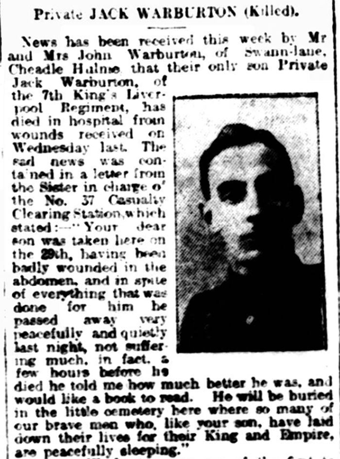 Jack had been born and brought up in the local area. He lived with his parents, John & Annie, and his two sisters, Dorothy and Rebecaa, at 18 Swann Lane, Cheadle Hulme. Jack worked in a linen warehouse in Manchester and had attended All Saints Sunday School. A keen sportsman, he played for the local football club. He enlisted, on 7 September 1914, at Southport, as part of a large contingent from that area. It's not known what connection he had with Southport. His enlistment papers show him to have been 5' 9" tall and of "fair" physical development. He went on active service on 8 March 1915. On 26 July, he received a gunshot wound to his hand. He was treated by the Field Ambulance and later admitted to No. 1 Casualty Clearing Station (a field hospital). After treatment there, he was admitted to No. 10 General Hospital at Rouen. On the 28th, he was evacuated to England aboard the Hospital Ship Carisbrooke Castle. He returned to duty in England on 12 October and was finally ready to go back on active service in the spring of 1916. he re-joined the 7th Battalion on 3 April and was attached to "A" Company. On 24 June 1916, a massive bombardment opened along the forthcoming Somme battlefield area. The main attack was intended for 1 July. Prior to this, regular raids on the enemy trenches were to be undertaken. These were intended to obtain "information concerning the nature of the enemy's defences, the taking of prisoners, the bombing of dug-outs, capture of machine guns and destruction of their emplacements." They were to take place along a much greater line of the front so that the enemy could not be sure where the forthcoming main attack would actually take place. There are no details of the raid conducted by the 1/7th Kings Regiment on 29 June, but it is known that 8 soldiers were killed and fourteen wounded. Jack was probably one of the fourteen wounded as, that day, he was admitted to the 1/3 West Lancashire Field Ambulance with a gunshot wound to his left side. He was later transferred to 37th Casualty Clearing Station but died the following day at 9.15pm. The Sister in Charge wrote to his parents "Your dear son was taken here on the 29th, having been badly wounded in the abdomen and, in spite of everything that was done for him, he passed away very peacefully and quietly last night, not suffering much. In fact, a few hours before he died, he told me how much better he was and would like a book to read."Jack's belongings were returned to his parents. These comprised a locket, some letters, a broken wrist watch and an upper set of dentures. After the war, Mr & Mrs Warburton were living at Chapel Lane, Ashton on Mersey.Jack is remembered on the Cheadle and Cheadle Hulme memorials.