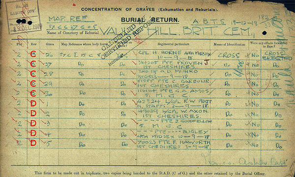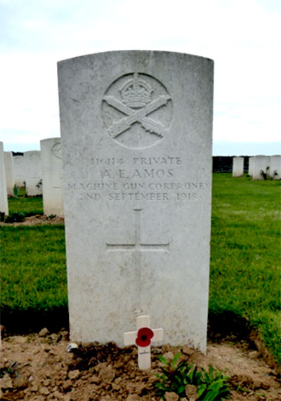 Private Amos is buried in Plot 2, Row C, Grave 30, Vaulx Hill Cemetery, Vaulx Vrancourt, France.