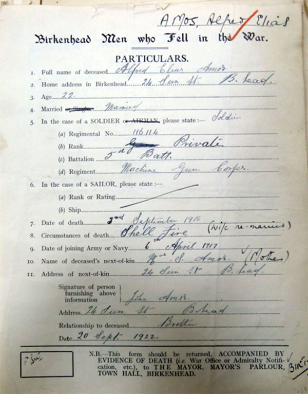 Family application form requesting Alfred to be added to the Birkenhead War Memorial.