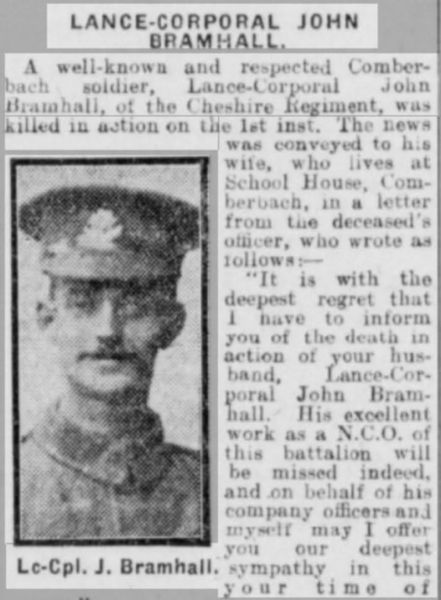 A well-known and respected Comberbach soldier, Lance-Corporal John Bramhall, of the Cheshire Regiment, was killed in action on the lst August 1917. The news was conveyed to his wife, who lives at School House, Comberbach, in a letter from the deceased's officer, who wrote as follows:
