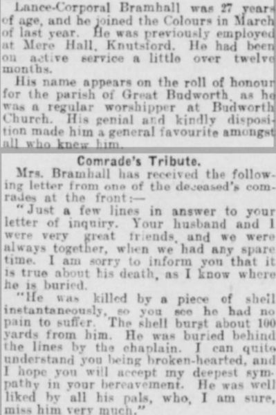 Lance-Corporal Bramhall was 27 years of age, and he joined the Colours in March of last year. He was previously employed at Mere Hall, Knutsford. He had been on active service little over twelve months. His name appears on the roll of honour for the parish of Great Budworth. as h# was a regular worshipper at Budworth Church. His genial and kindly disposition made him a general favourite amongst all who knew him.
