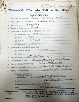 Family application form requesting Allan to be added to the Birkenhead War Memorial.