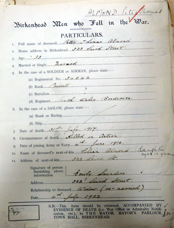 Family application form requesting Peter to be added to the Birkenhead War Memorial.