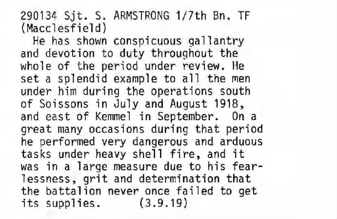 On 30 May 1919, the Macclesfield Times reported that Sgt Armstrong had been awarded the DCM: