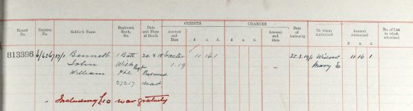 John William Bennett was born in the summer of 1896, in Ardwick, Manchester, the son of John James Bennett (1861 - 1929) and Alice Ann nee Anderson (1861 - 1935). He had ten brothers and sisters, including Bertha. By the time he was five, the family was living at 66 London Road, Willaston, Cheshire. On March 31st 1901, their residence was at Station Road, Alsager. In April 1911, the family home was at 12 Union Street Crewe, but they had moved within the next four years to 45 Nantwich Road.