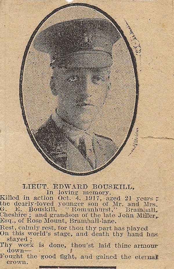 Edward was the younger son of George and Sarah Bouskill of "Romanhurst" Bramhall Lane, Bramhall (and later "Bramhall Grange" on the same road). His older brother, Clifford, served as a Lieutenant in the 1/10th Battalion, Manchester Regiment. He had attended Manchester Grammar School and Stockport Commercial School and was studying at Manchester University when War was declared in August 1914. He joined its Officer Training Corps in January 1915 and was commissioned as a 2nd Lieutenant in the April. He is known to have been a member of one of the local lacrosse clubs.